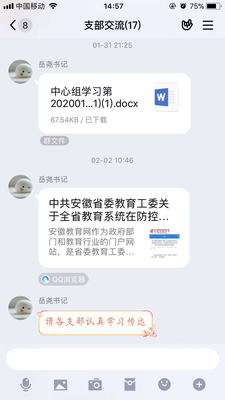 加强宣传学习,切实把广大党员和师生思想统一到党中央决策部署上来。通过党建工作群、学院工作群、辅导员工作群、班级群及电话等方式,及时传达学习习近平总书记关于新型冠状病毒感染的肺炎疫情防控工作重要指示精神、学校疫情防控工作部署和要求,宣传新型冠状病毒防控科普知识,做到学习宣传覆盖全体师生。广大党员和师生坚定信心,增强责任,自觉落实各项防控措施,用实际行动支持党中央决策部署。