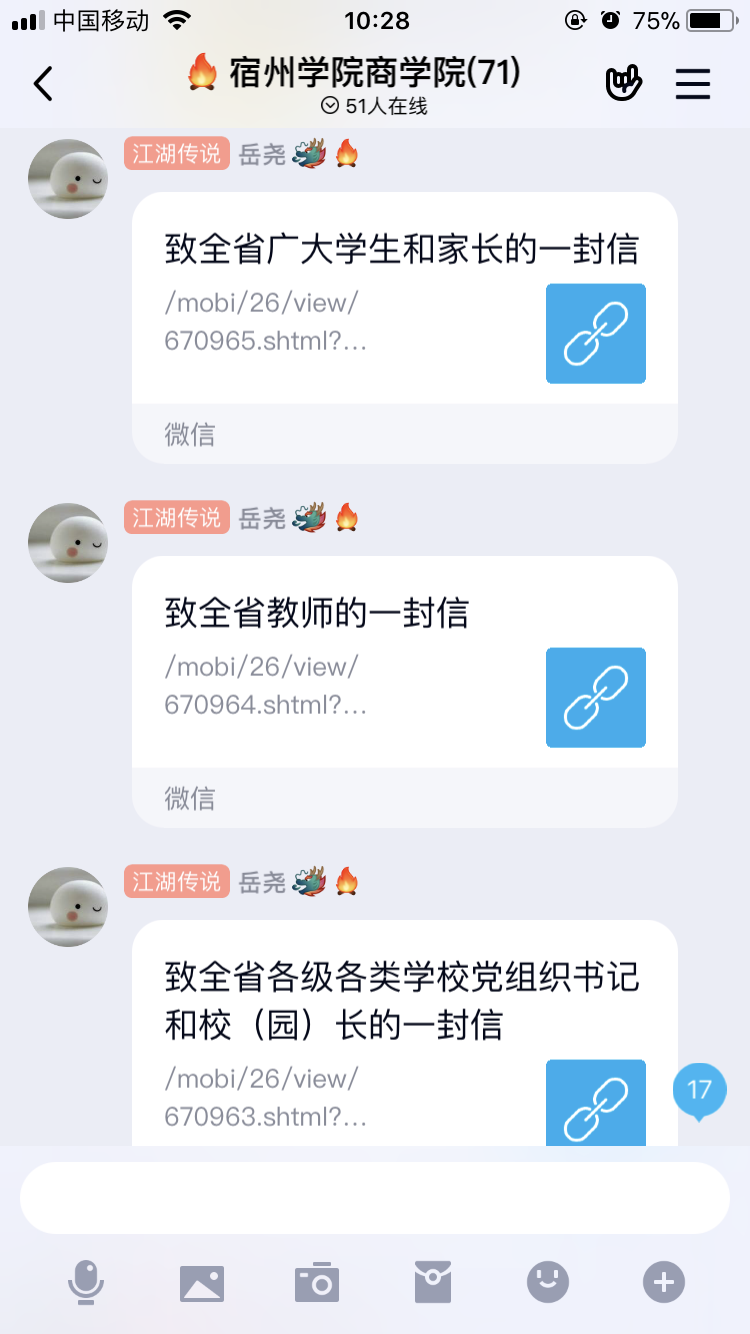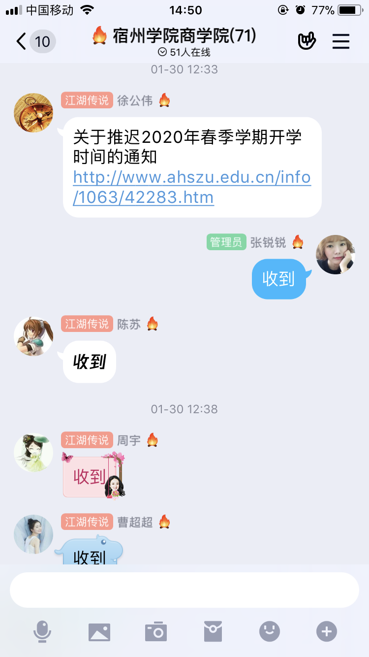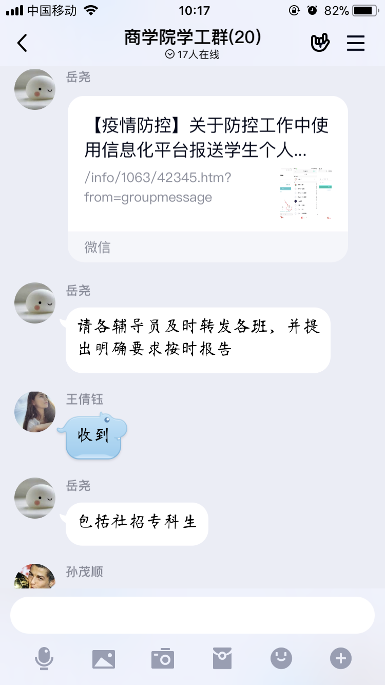 全员上阵,履职尽责,为打赢疫情防控阻击战贡献力量。学院党政办主任、党总支秘书、学生工作专干、辅导员等严格执行疫情“日报”制度,每天统计师生的身体健康情况、有无外出等动态信息,以及从湖北回皖的师生信息等,及时向学校相关部门进行汇报。全体师生积极响应支持,主动报告个人情况。辅导员认真督促学生每天登陆“今日校园”APP,填写“疫情每日一报”,掌握每位同学的寒假去向和即时状态,及时传达延迟开学、杜绝提前返校等通知要求。对于目前滞留湖北或实习单位等特殊情况的学生,积极跟踪关注、做好心理疏导。实训中心、团总支、就业工作专员等积极做好疫情期间学生实习管理、志愿者和就业服务工作。教学科研秘书按照教务处“关于应对疫情做好我校2020春季学期在线课程教学的通知”精神,制订了《商学院关于应对疫情期间教学工作方案》,鼓励教师开展网络直播授课,利用优质网络平台资源积极开展混合式改革,做好网上答疑、论文指导等,保证疫情防控期间教学工作正常开展。广大教师积极配合落实,及时加入2020春季网络教学群,认真做好网上教学各项准备工作,以实际行动坚决支持打赢疫情防控阻击战。