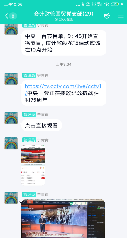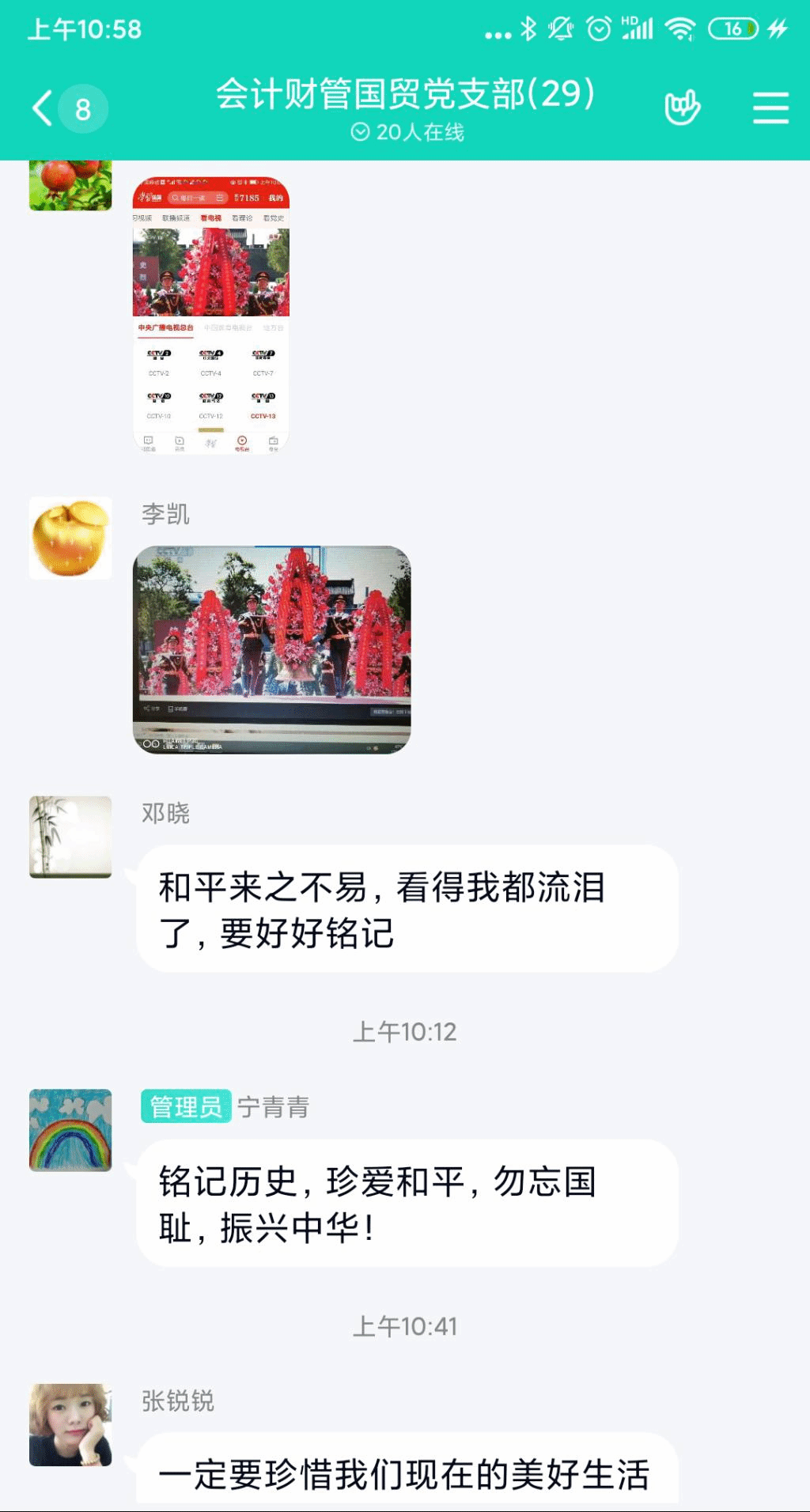 9月3日上午10点,商学院以线上线下相结合的方式,组织师生员工收看中国人民抗日战争暨世界反法西斯战争胜利75周年纪念日活动直播。