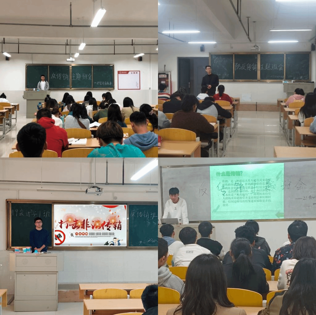 活动开始以来,商学院各个班级依次召开了防范传销宣传教育主题班会。通过主题班会向同学们宣传讲解了当前传销活动的新特点、新形势,用实际案例揭示了传销组织从过去的“商品传销”传统方式,转变为利用互联网,打着直销的幌子采取“微商”、“电商”、“消费投资”、“旅游互助”、“特许加盟”等新方式。各班级通过一系列典型案例的分析和防范传销的方法讲解等,让同学们了解传销的危害,进一步增强大学生防范和抵制传销的能力。