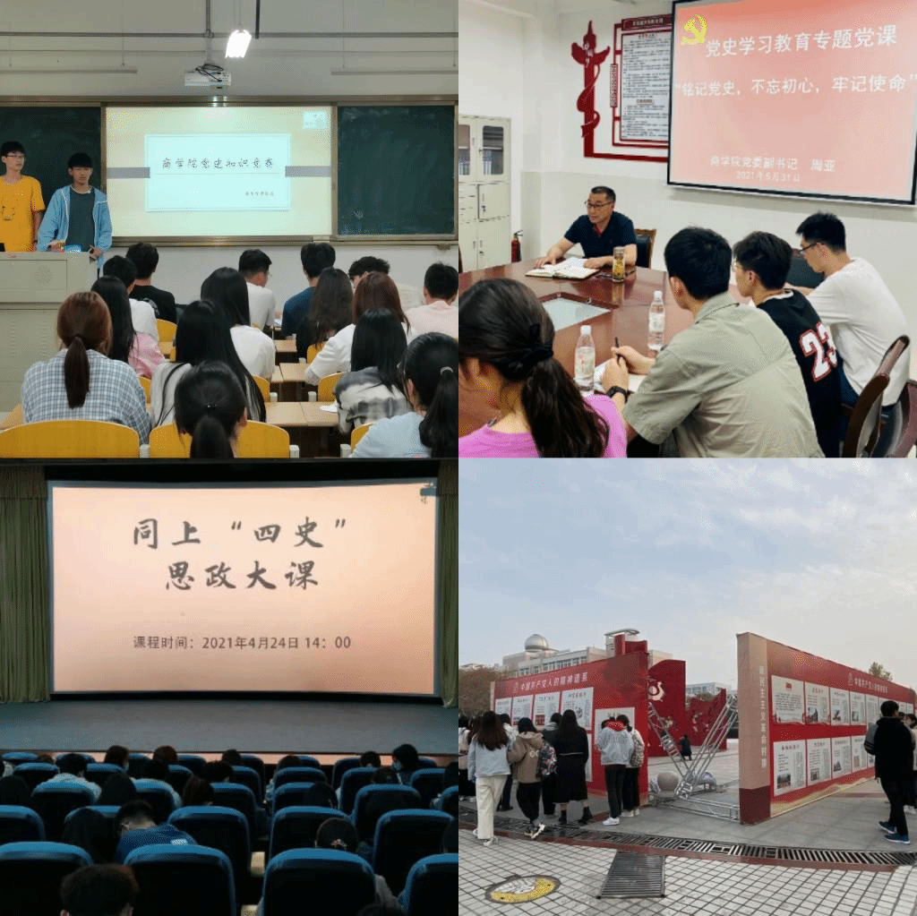 结合“红色”向上教育,学院组织开展各类学习党史主题活动。2021年5月和10月,商学院团委组织两场“学习党史,做时代新人”知识竞赛活动,学院学生参与人数达200人。学院以党支部为单位,开展各类红色主题党日活动。通过学院党委书记讲党课,组织学生学习“中国共产党人精神谱系展”,开展师生“同上四史”党史学习教育等,引导大学生知史爱党、学史爱国。