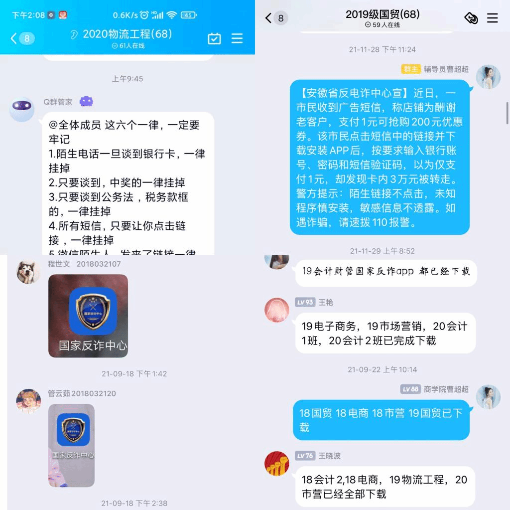 为进一步防范电信诈骗,保障学院学生人身财产安全,学院开展各类防范电信诈骗案例警示教育。各班级加强宣传,全面提升学生防电诈意识。辅导员通过QQ、微信在班级充分宣传,每天至少推送一条关于电信诈骗的典型案例或防骗知识。各班级组织开展涉“两卡”犯罪警示教育主题班会,对犯罪份子作案模式进行分析,将高校大学生电信诈骗真实典型案例作为警示材料,引导学生下载使用“国家反诈中心”APP等,加强宣传教育,有效防范风险。