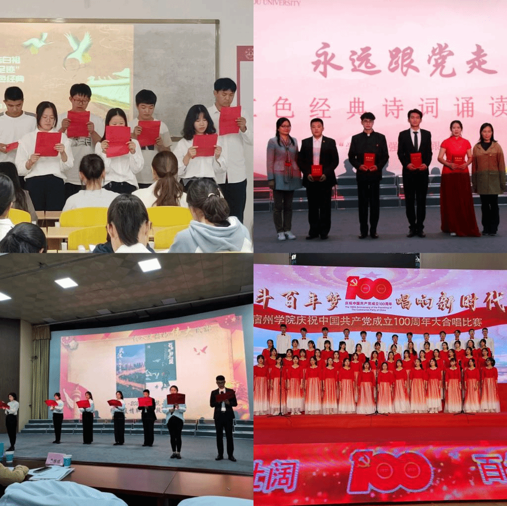 为引导同学们积极学习红色经典文化,学院团委举办了“青春告白祖国,追寻红色足迹”经典诵读活动,我院各专业的同学以饱满的感情,真挚的语言,激昂的语调,讲述了许多红色经典故事,倾诉着对祖国母亲和中国共产党的热爱之情。学院组织师生共同参与宿州学院“永远跟党走”经典诵读大赛,选送作品《党旗颂》荣获校级二等奖。在宿州学院“奋斗百年梦,唱响新时代”庆祝建党100周年全校师生合唱比赛,商学院师生选送作品《妈妈教我一支歌》,表达了浓烈的爱国爱党之情,最终获得校级三等奖。