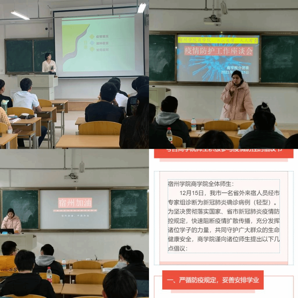 在目前疫情新形式下,高校防疫工作仍然是安全管理重中之重。尤其是面对2021年下半年我市的疫情情况变化,学院严格按照宿州市和宿州学院疫情防控要求开展各类防范疫情安全教育活动。开展班级防疫主题班会,各班级通过QQ微信及时传达疫情相关情况,通过“今日校园”APP及时填报学生信息,及时统计相关学生出行信息等。学院分团委学生会组织开展疫情知识竞赛,组织各班级学生干部“共抗疫情,人人有责”疫情防护工作座谈会,学生代表们纷纷对学院疫情防控和学生管理建言献策,同时学生干部自发拟定“勠力同心,齐心抗疫”倡议书并宣传至各班级,倡导学院学生严循防疫规定,加强安全管理。