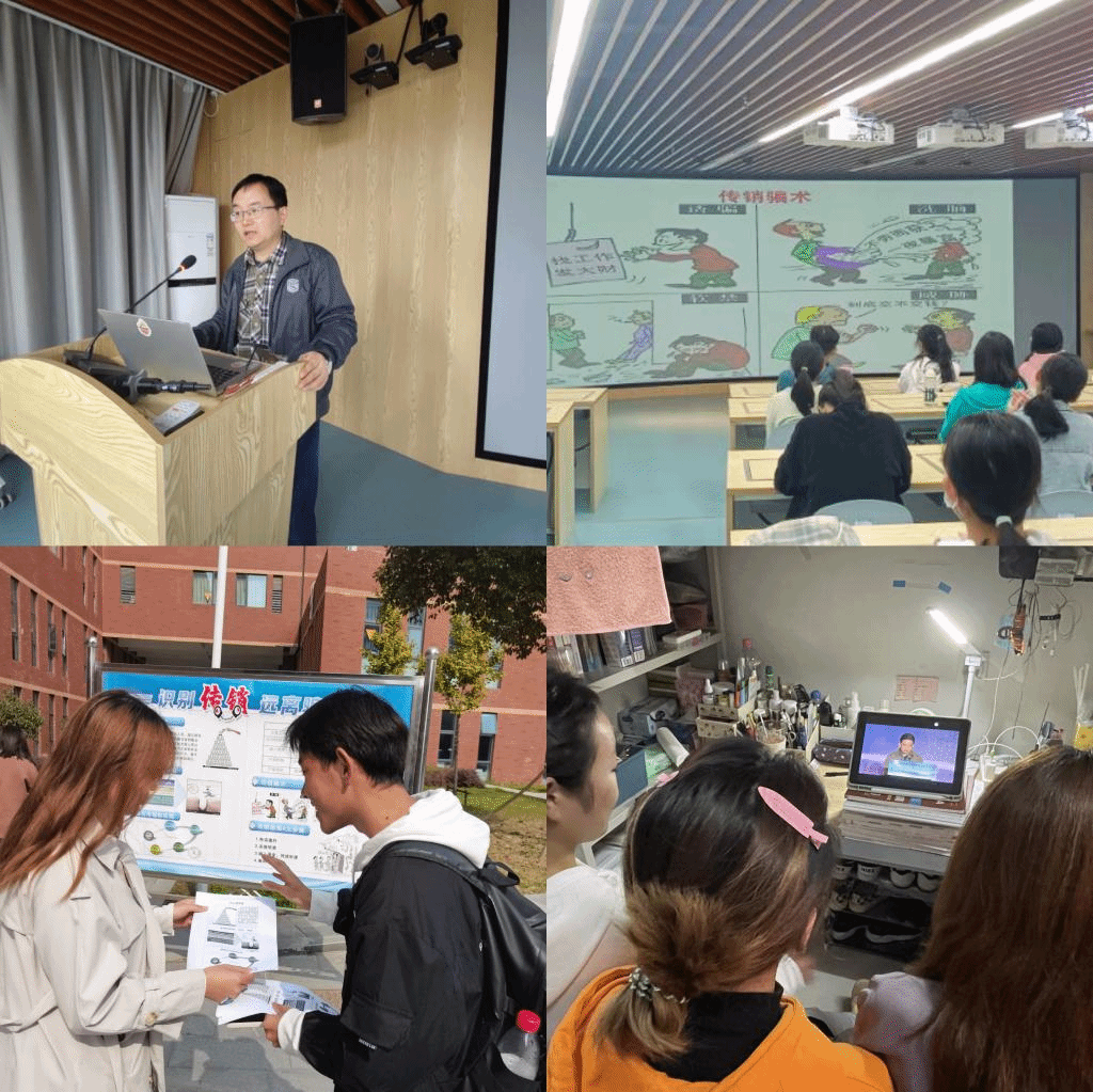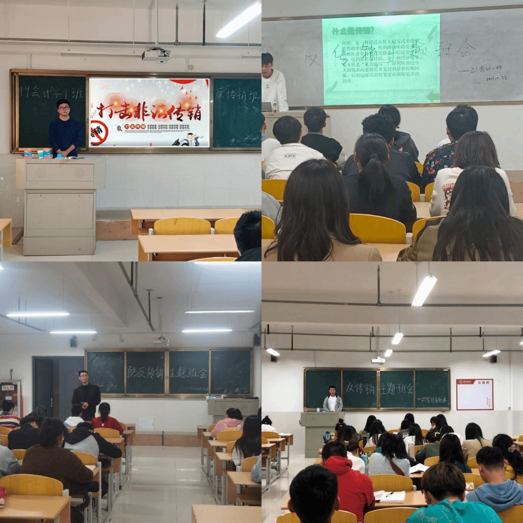 学院开展2021年校园防范传销宣传教育活动。各班级开展防范传销宣传教育主题班会,通过一系列典型案例的分析和防范传销方法讲解,让同学们了解传销的危害。商学院党委书记肖良为学院学生开展“识别传销、远离骗局”主题宣传教育知识讲座,就大学生为何会陷入传销泥沼展开了深入论述,强调只有树立正确的价值观,加强法律知识的学习,克服浮躁的心态,才能识别传销、远离骗局。学院团委组织学生观摩打传规直普法大讲堂,组建校园反传销宣传志愿者队伍,开展宣传志愿服务活动,通过各类大学生深陷传销的危害案例向大学生开展警示教育。