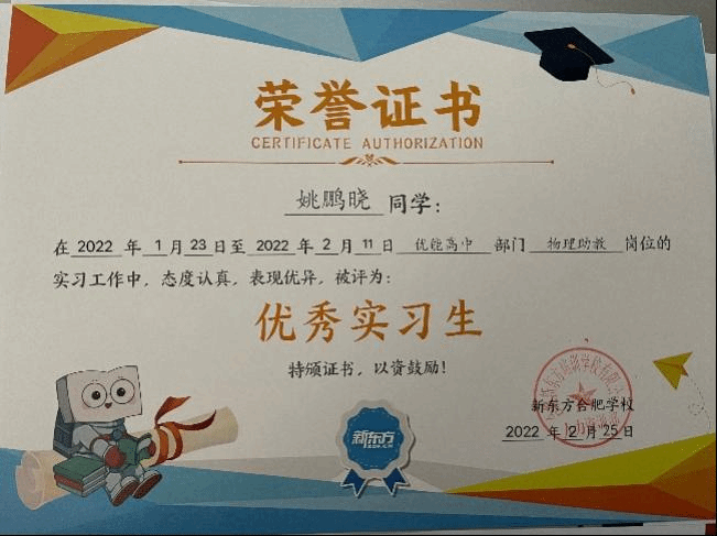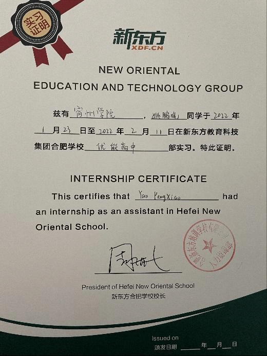 在2021年寒假期间,21会计学一班的姚鹏晓同学作为一名物理助教,在新东方教育科技集团合肥学校优能高中部进行了为期一个多月的实习。在此次实习中,他主要负责辅助课堂教学,组织相关考试,记录学员成长等工作。在校期间,他在老师和同事们的悉心关怀和指导下,通过自身不断努力,各方面都取得了进步,也获得了“优秀实习生”的称号,并且和同学们度过了一段愉快的时光。此次实习经历给姚鹏晓同学留下了精彩的回忆,也将为他未来离开学校、融入社会提供了宝贵的经验。
