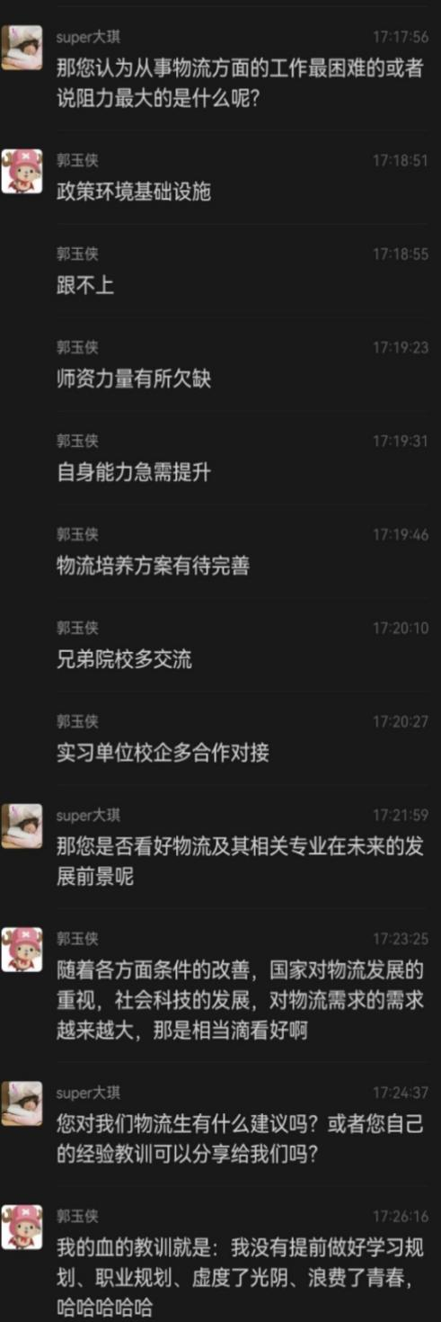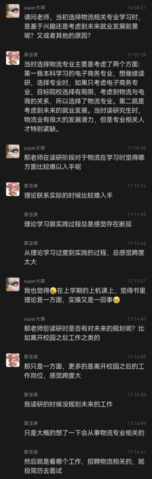 从大一升入大二,从懵懂到适应大学生活,为了给接下来两年半的学习做铺垫,以及更好地投入未来的工作,20物流工程的肖雨琪准备为自己制作一份职业生涯规划设计书。借此次寒假“两个一”社会活动,肖雨琪同学访问了她的物流专业老师郭玉侠,并寻求帮助,郭老师是其专业的讲师以及管理学硕士。通过与郭老师的交流以及老师对她职业规划的建议,肖雨琪同学进一步了解了本专业的历史、就业环境与前景,并完成了自己的职业生涯规划设计书。