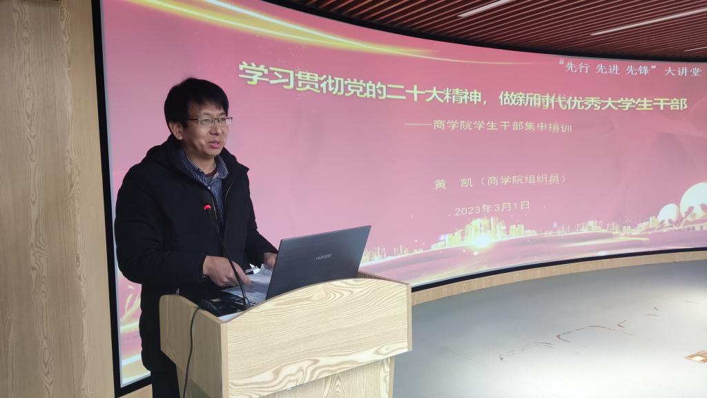 最后,黄凯为全体学生干部进行了“学习贯彻党的二十大精神,做新时代的优秀大学生干部”主题培训。黄凯书记就如何看待大学生干部、怎样成为优秀的大学生干部、如何处理大学生干部面对的现实问题三个方面进行了深入的讲解,他用典型的案例、生动的语言为学生干部上了一堂精彩的培训课。他用习近平总书记关于青年的寄语嘱托学生干部,希望同学们要挺鹰担任,充满朝气,以奋斗的姿态激扬青春,不负青春,不负华年。