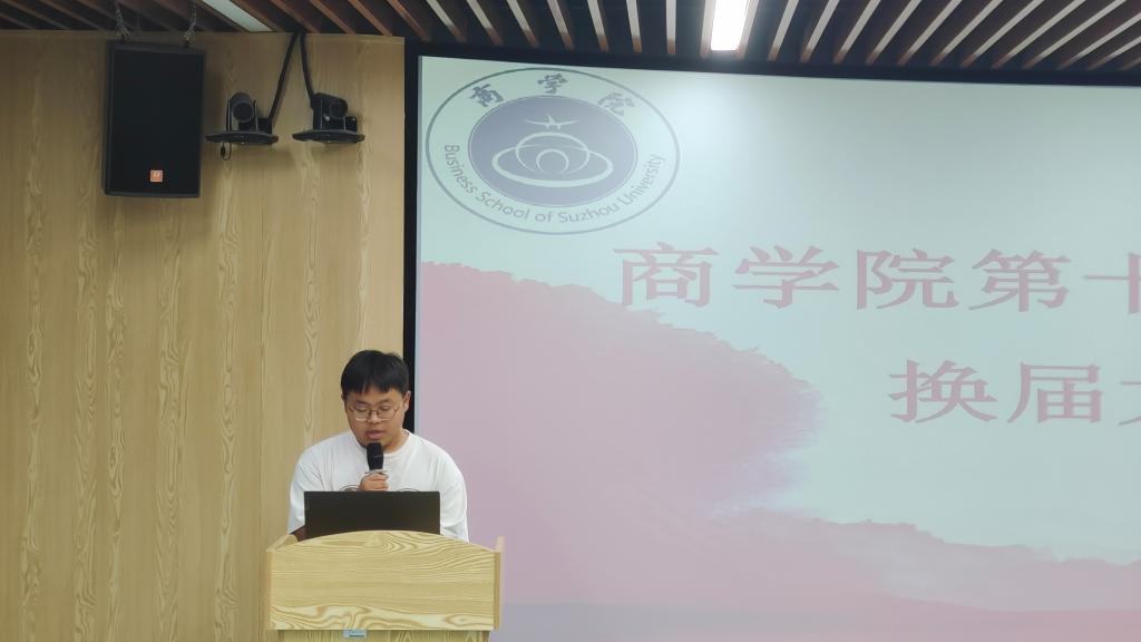 会议由周亚主持。周亚首先慰问了军训的新生,让新生感受到学院的人文关怀,随后对商学院分团委学生会做了简短介绍,并介绍了仪式的流程。紧接着,曹超超宣读换届名单并颁发聘书。