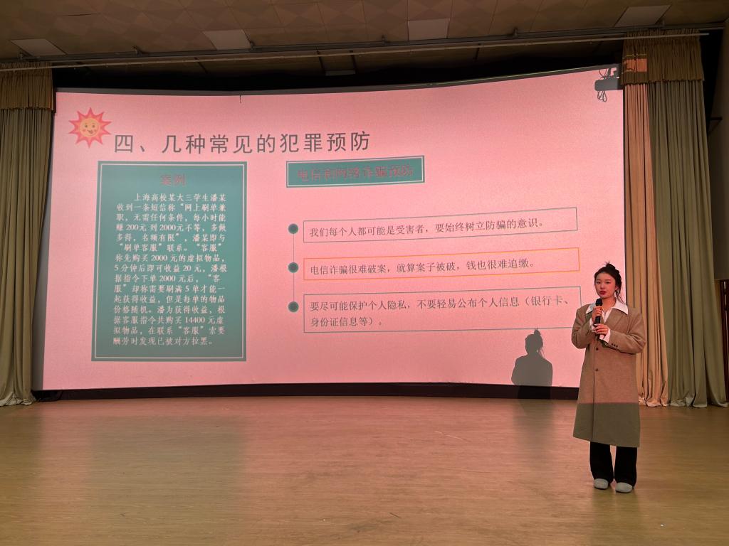 在课程第一节“青春普法篇”中,情景剧《今天你被“诈”了吗》通过电信诈骗案例的演绎,在轻松幽默的氛围中为同学了上了一堂普法教育课,告诫同学们要提高自我保护意识,用法律守护人身和财产安全。紧接着,来自普法学会的李乐瑶同学进行了《以法为盾 护航青春》的普法宣讲,通过典型案例分析,重点讲解了“大学生常见的违法犯罪行为”以及“常见的犯罪预防”,进一步引导大学生学法、懂法、守法、用法,用法律护航青春。