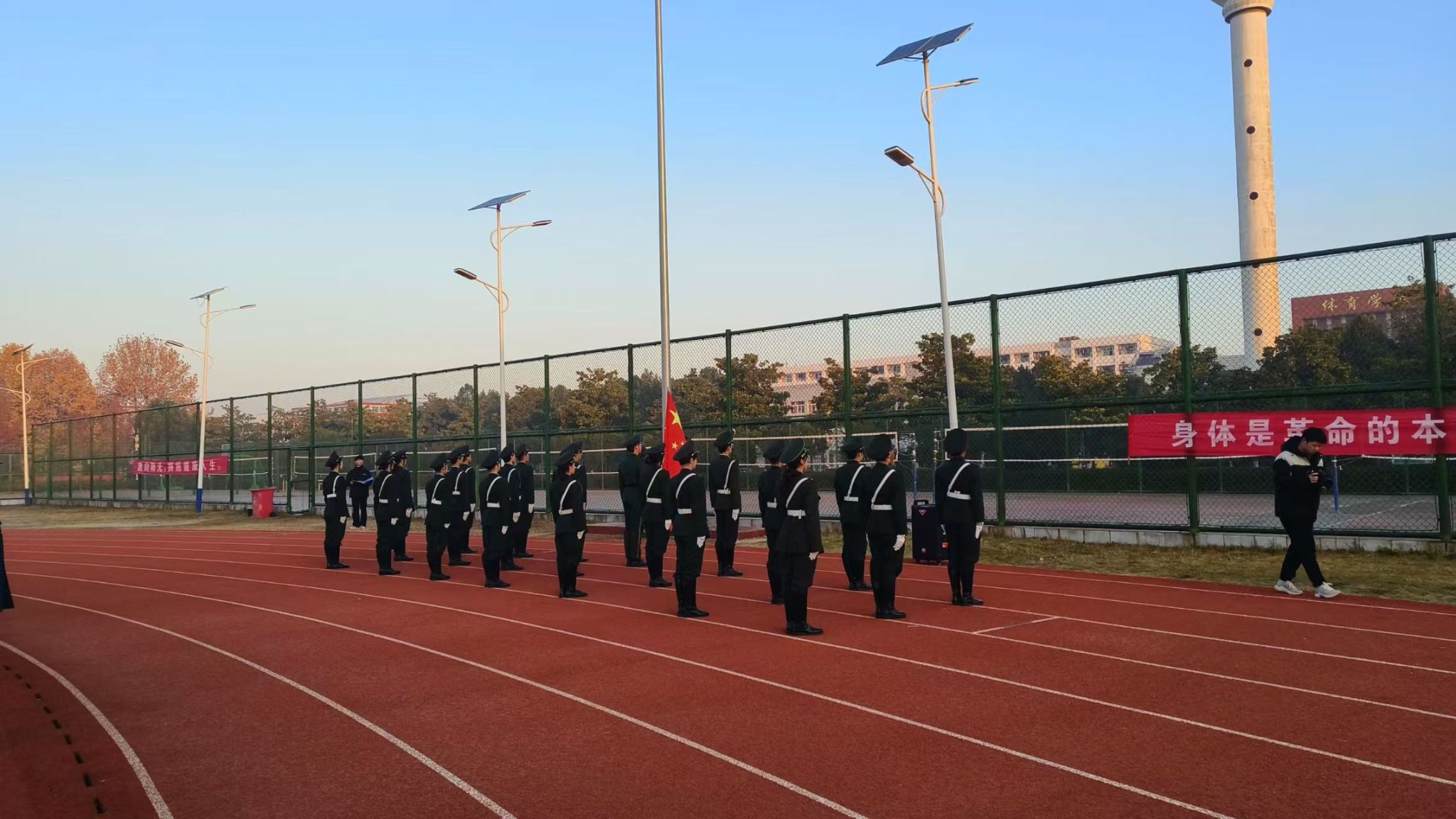 伴随着朝阳正式开始,在全体师生的注目下,英姿飒爽的国旗护卫队队员护送鲜艳的五星红旗入场,行礼完毕,伴随着庄严的《中华人民共和国国歌》,五星红旗冉冉升起,迎风飘扬。