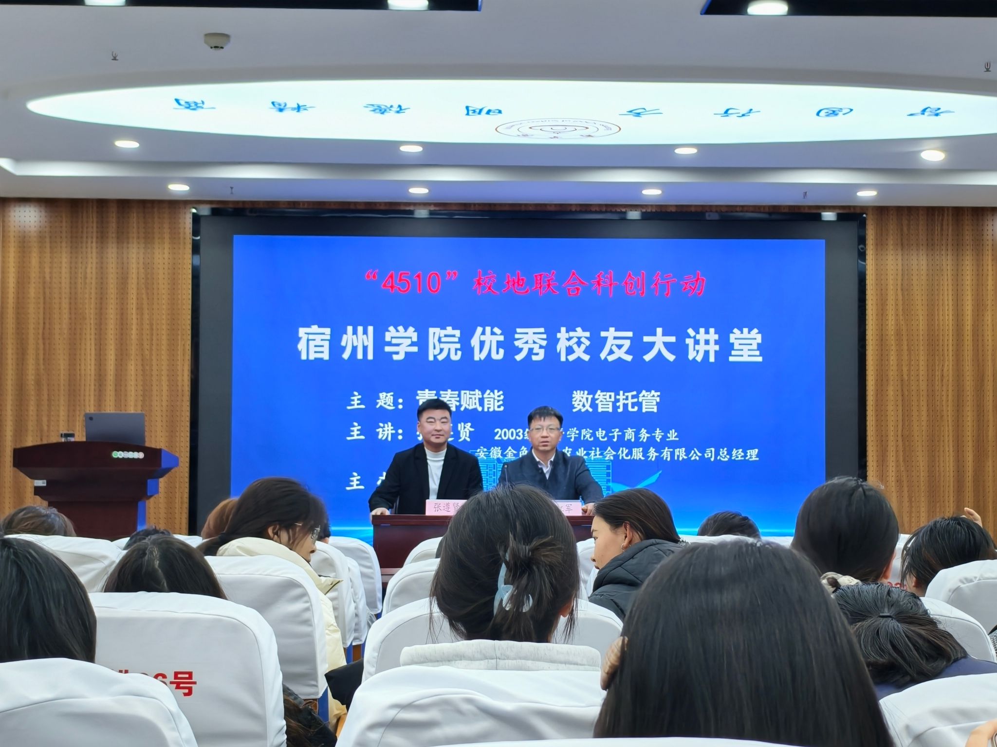 11月28日下午,商学院在实训楼B117报告厅举办优秀校友大讲堂活动。本次活动邀请商学院2006届优秀毕业生、安徽金色家园农业社会化服务有限公司总经理张遵贤先生重返母校,为在校师生作“青春赋能,数智托管”主题讲座。商学院党委副书记、院长刘红军出席并主持,百余名师生参加了讲座活动。