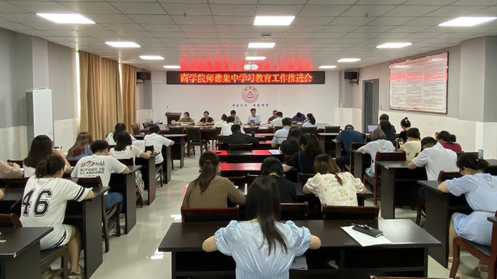 为推动学习贯彻习近平新时代中国特色社会主义思想主题教育走深走实,进一步加强师德师风建设,7月4日上午,商学院在实训楼B517会议室召开师德集中学习教育工作推进会。商学院领导班子成员、全体教职工参加会议,会议由党委书记肖良主持。