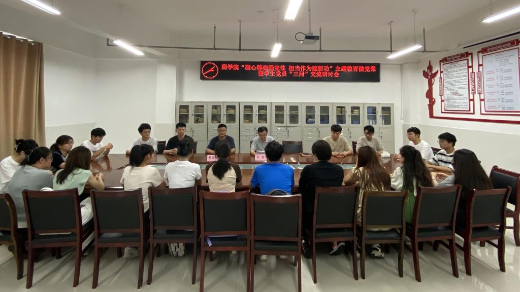 6月29日下午,商学院在实训楼B507会议室举办“凝心铸魂强党性 担当作为建新功”主题教育微党课暨学生党员“三问”交流研讨会。邀请江苏师范大学马克思主义学院博士生导师、江苏省高校思政课教指委“习近平新时代中国特色社会主义思想概论”课分教指委委员贾彦峰教授讲授主题教育微党课。商学院专职组织员(党务秘书)张锐锐及二十余名学生党员代表参加了会议,会议由党委书记肖良主持。