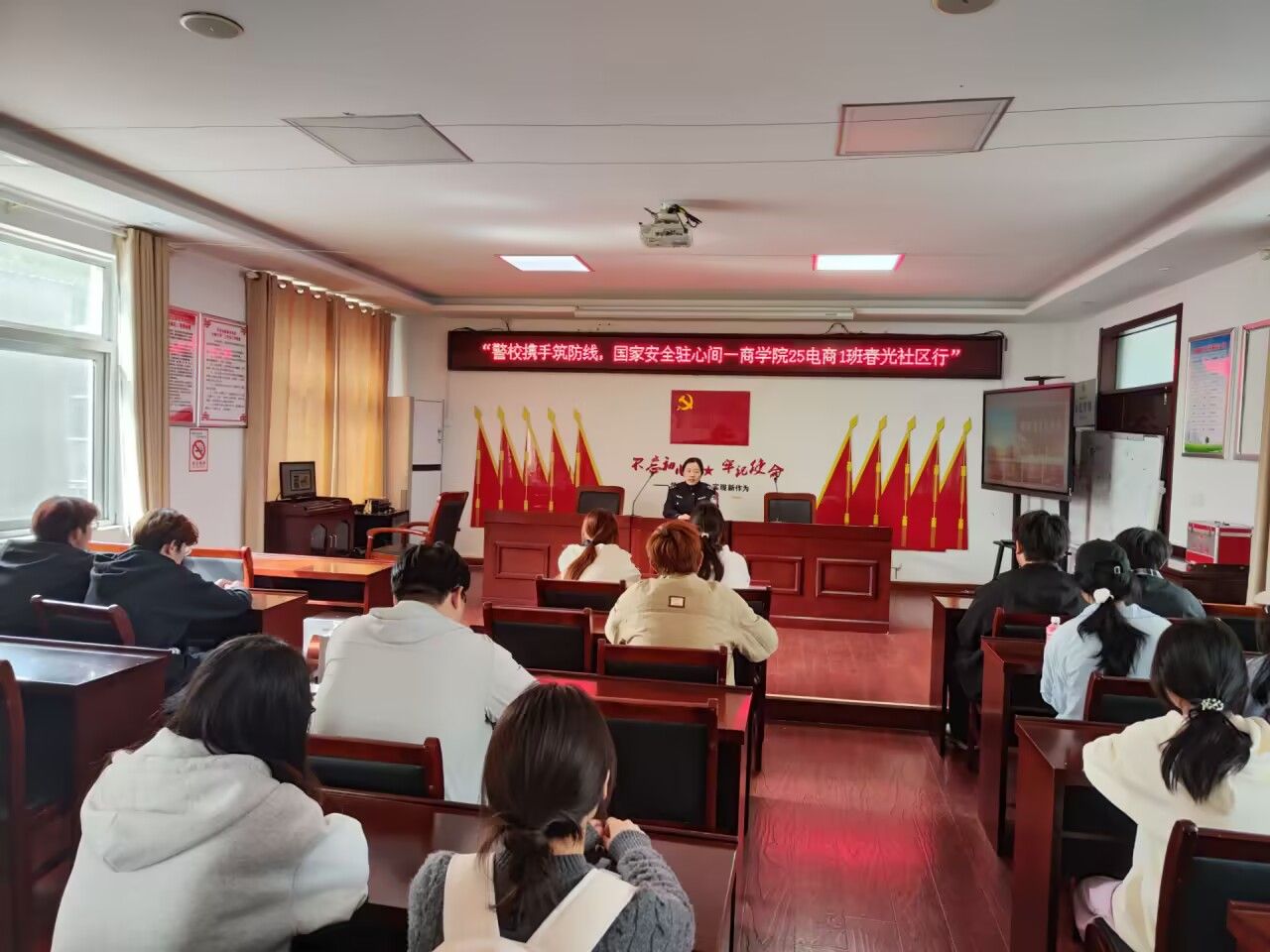 为进一步深化理论学习效果,团支部组织团员代表前往沱河街道春光社区参与社区组织的“警校携手筑防线,国家安全驻心间”国家安全知识宣传活动。在社区工作人员和民警的带领下,同学们认真学习了国家安全相关实用知识,并通过互动交流巩固自身所学,展现出电商专业学子良好的精神风貌和责任担当。