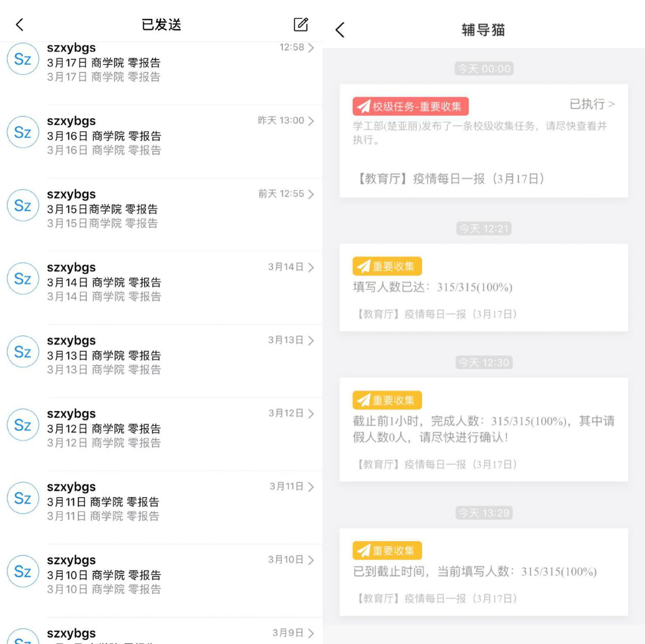每天中午12点之前,张锐锐都要统计学院全体教师及5个班级共314名学生的身体健康情况、有无外出等动态信息并及时向学校相关部门进行汇报,督促学生每天中午之前登陆“今日校园”APP填写“疫情每日一报”。坚决落实学校要求,及时传达学校关于延迟开学时间、杜绝提前返校等信息,保证学校通知传达到每位同学,掌握每位同学的寒假去向和即时状态。