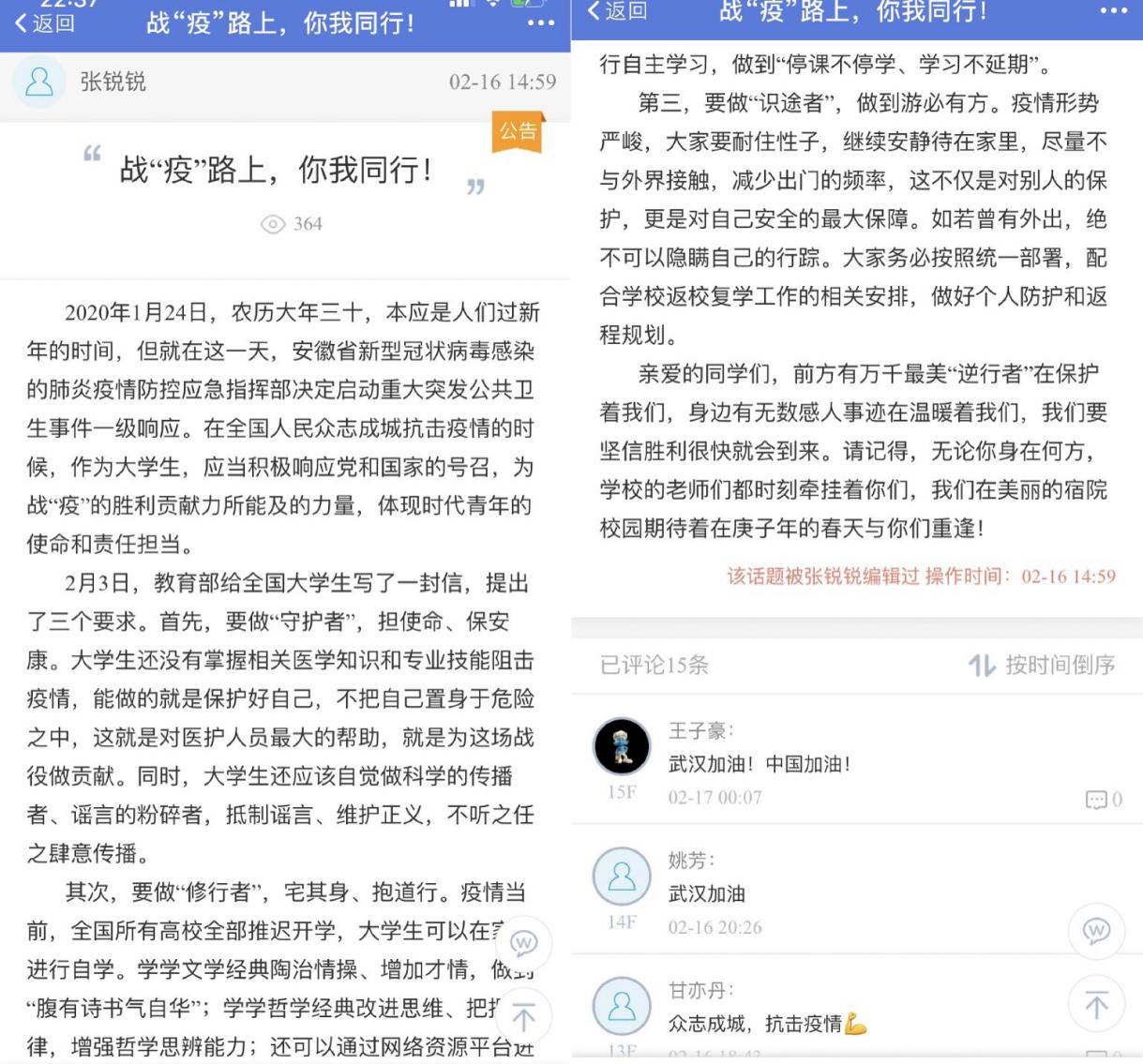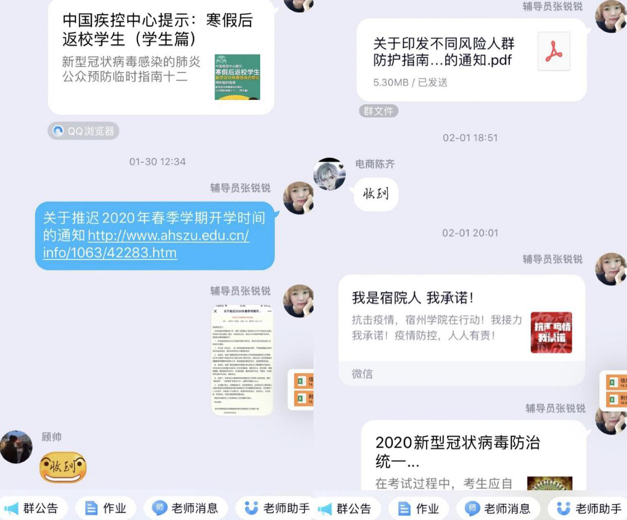 张锐锐始终把“做好宣传,不信谣、不传谣”作为己任。当疫情一发生,有些学生就在班级群里发了一些从不同渠道得到的消息,其中不乏一些谣言。为了让学生既能正确认识到情况的严峻和危急,又不引起恐慌,张锐锐每天严格把控班级群里的言论,发现有些不切实际的谣言时,及时给予指出,引导学生不信谣。同时,她还每天关注疫情的发展情况,找到官方言论在班级群里进行宣传,普及防控知识。