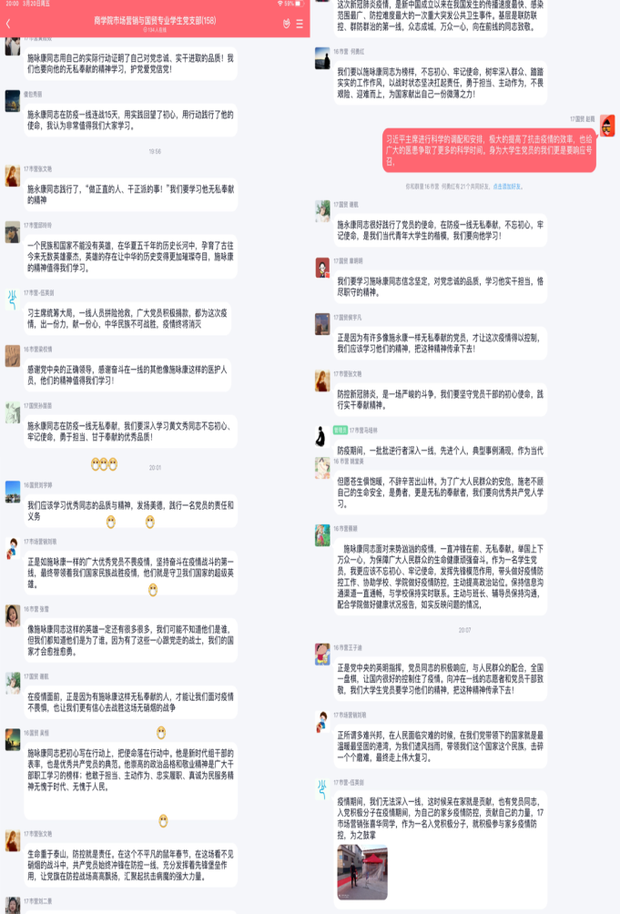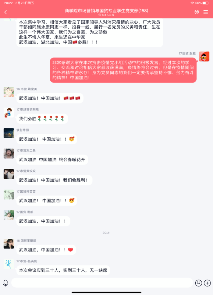 各位党员同学在群内积极发言,习近平总书记的统筹大局让我们看到了胜利的力量!就如市场营销小组的王子迪同学所言“正是党中央的英明指挥,党员同志的积极响应,与人民群众的配合,全国一盘棋,让国内很好的控制住了疫情。向冲在一线的志愿者和党员干部致敬,我们大学生党员要学习他们的精神,把这种精神传承下去!”。