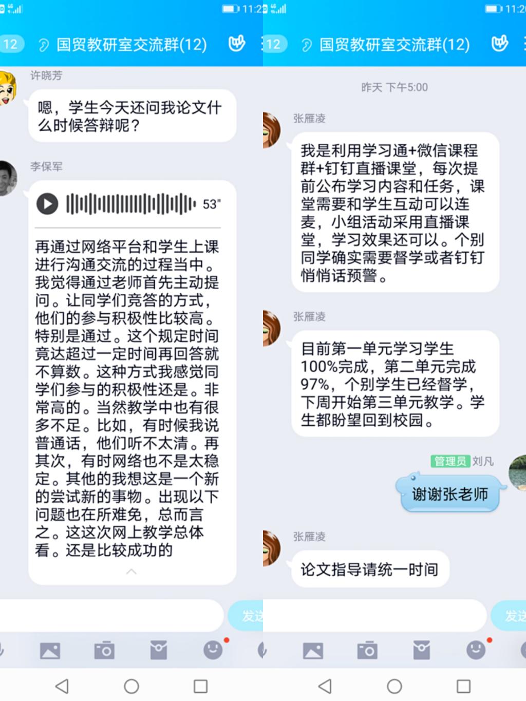 “线上教学”主题讨论后,国际经济与贸易教研室进一步确定了2020届毕业论文完成初稿、定稿的时间,各位毕业论文指导老师将严格按照2020届毕业论文工作方案,通过电话、电子邮件、QQ、微信等方式,与学生保持联系,进行远程指导,按期完成相应指导任务。
