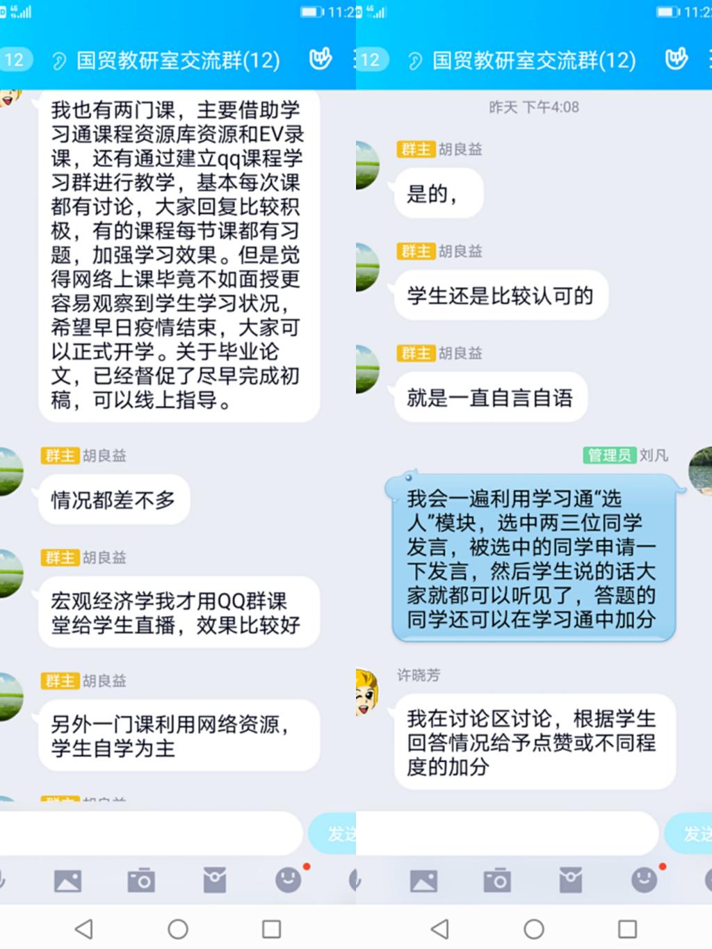 本学期,除实践课程老师外,国际经济与贸易教研室共有8位老师开展了14门课程的线上教学。各位授课老师严格按照《宿州学院2020年春季线上教育教学实施方案》,至少准备了两套不同的线上教学方案,建立了课程教学班级QQ群和微信群。根据《宿州学院线上教学课程授课计划》,各位老师已按计划完成了四周的教学任务,在有关“线上教学”的讨论中,老师们各抒己见、群策群力。