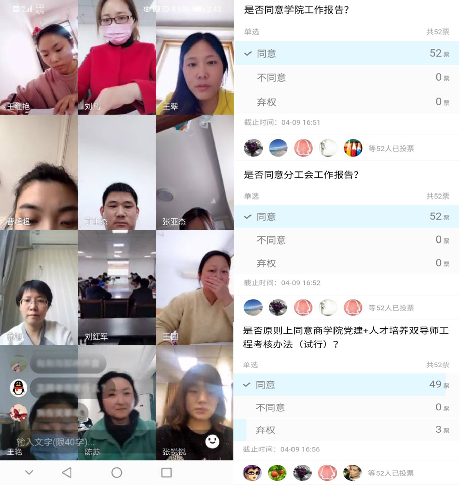 全体教职工大会第二次会通过网络投票的方式,表决通过了《学院工作报告》、《分工会会工作报告》、《商学院“党建+人才培养双导师工程”考核办法(试行)》。