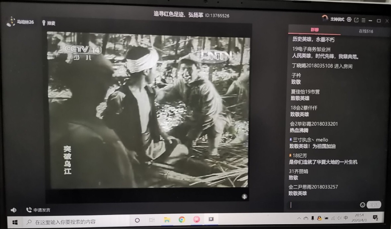 观看过程中,同学们聚精会神,认真观看影片,被老一辈共产党人的爱国救国之情打动,在消息栏纷纷发表感想,如18财管1班的纪芳说:“是中国共产党用鲜血造就了新中国,向他们致敬”;19电子商务的邹业洲说:“人民英雄,时代先锋,我辈典范”…….