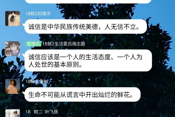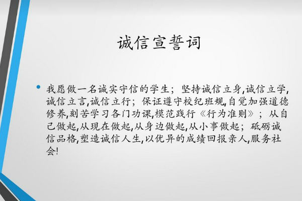 诚实守信,是传统道德的一个重要内容,也是中华民族传统美德的一个重要规范。随着时代的不断发展,诚实守信也被赋予了新的时代内涵,本次线上诚信宣誓活动倡议学生:树立诚信风尚,做自强青年,立诚信身、做诚信人、践诚信事、交诚信友,做新时代诚信大学生,让诚实劳动、服务社会、诚信交往成为青春最靓丽的风景线,以实际行动回报社会,将诚信进行到底。通过诵读诚信宣誓词、观看诚信宣传片、诚信主题讨论,同学们明确了“诚信”的意义,懂得了“诚信”对学生自身发展和为人处世的重要意义。