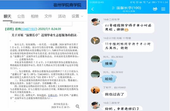 7月4日、5日,是宿州学院2020届毕业生离校的日子,商学院“温馨长亭”专用QQ群热闹起来,党员教师开展的“温馨长亭”送别毕业生志愿服务活动在不时地对接着。