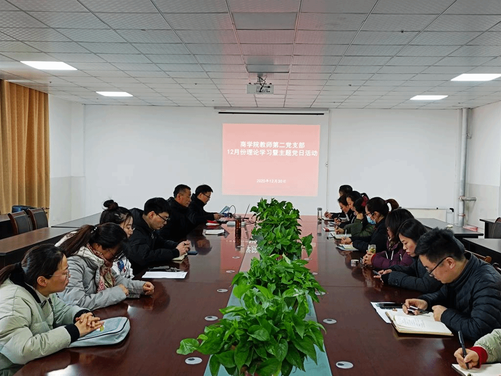12月30日下午,商学院教师第二党支部在实训楼B513会议室开展12月份主题党日活动暨政治理论学习会议。商学院党委副书记周亚及教师第二党支部全体成员参加了本次活动,会议由支部书记刘红军主持。
