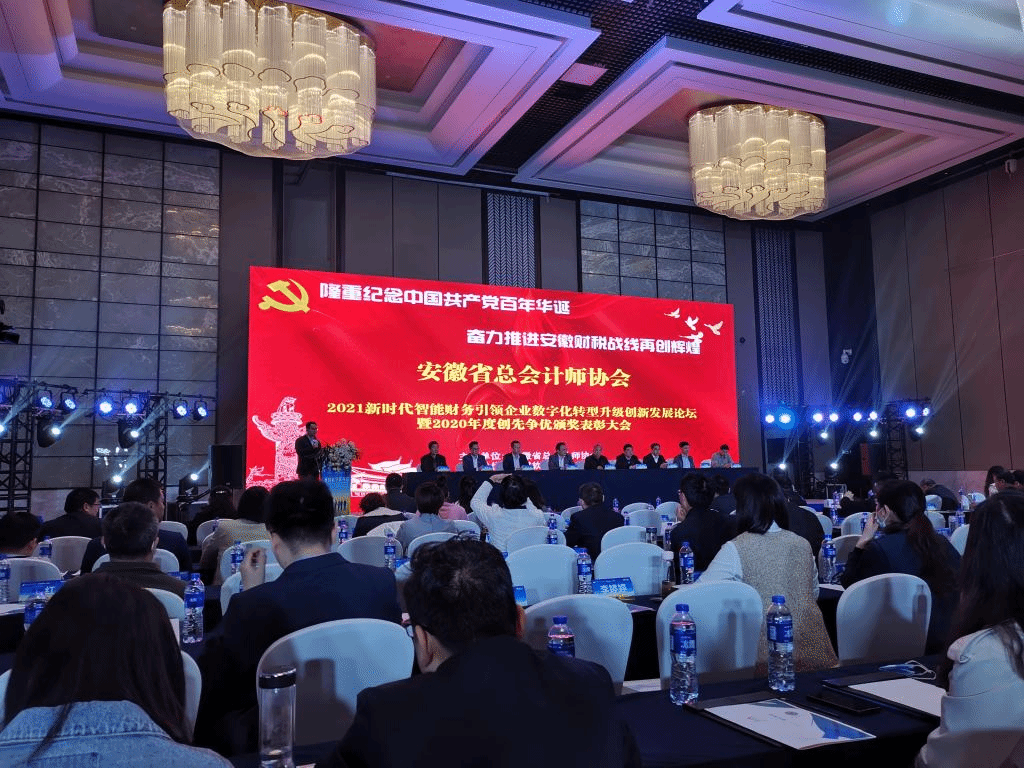 为庆祝中国共产党成立100周年,推动新时代安徽省会计行业智能财务管理快速发展,推进行业建设,强化凝聚力,安徽省总会计师协会于2021年4月18日在合肥市中国书法大厦举行了“2021新时代智能财务引领企业数字化转型升级创新发展论坛”。来自安徽省财政厅、科协、民政厅、国资委以及省内企事业单位的300余位会计、财务方面的专家、学者参加了此次论坛,我校商学院纵实、李仲轶两位老师应邀赴会。
