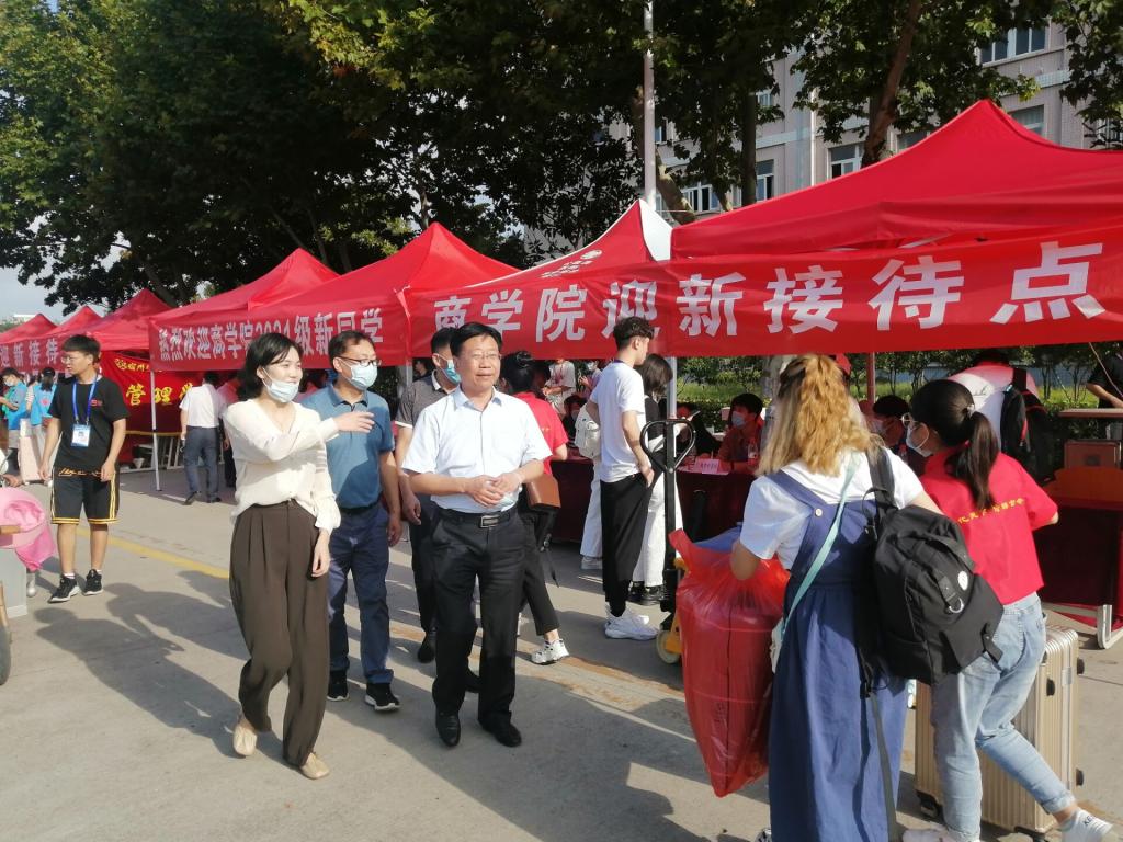 2021年9月12日上午6时,踏着夏末秋初清晨的第一缕阳光,商学院迎新工作有序的开始了。7点之前,迎新接待点已经设置完毕,商学院迎新宣传展板,横幅,院旗等物品已布置完毕,迎新志愿者队伍集合完毕,佩戴统一的工作牌,带着饱满的热情迎接学院的“新鲜血液”。商学院党委书记肖良,副院长(临时负责)刘红军,副书记周亚,副院长周书灵,副院长宁青青,组织员黄凯以及团委老师,新生辅导员都亲临现场安排工作。同时,我校党委书记汪刘送,校长张莉等莅临我院迎新点,关心关注新生报道情况。