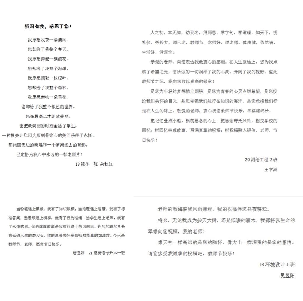 为进一步推进“三全育人”综合改革,构建“十大育人”体系,深入学习贯彻习近平新时代中国特色社会主义思想和习近平总书记关于教育的重要论述精神,引导广大青年学生继承和发扬中华民族尊师重教的传统美德,我院于2021年9月1日至9月10日开展“心系师恩,寄语传福”教师节主题活动。