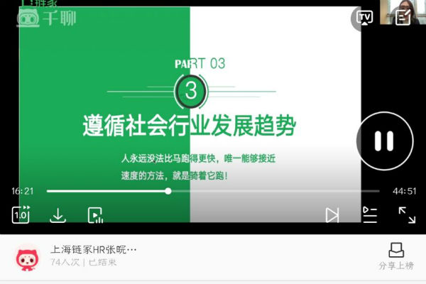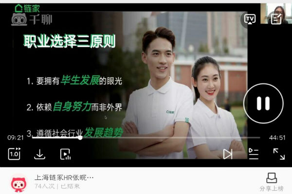 线上简历面试公开课期间,上海链家专业导师分别为求职学生讲授了《大学生职业生涯规划》和《简历制作与面试技巧》两门校园公开课。杨颀老师介绍了2022届毕业生的校招情况,一是求职周期拉长,就业慢;二是求职竞争愈加激烈。杨老师向同学们讲述了毕业生职业选择三原则:一要拥有毕业发展的眼光,二是依赖自身努力而非外界,三要遵循社会行业发展趋势。第二堂课,杨颀老师向同学们传授了简历制作和面试技巧,并从面试着装、面试官提问以及回答问题技巧等方面具体谈论了求职面试的注意事项。