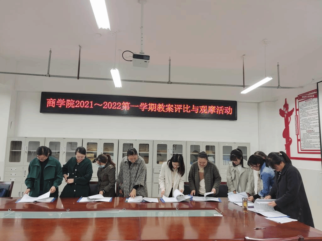 为贯彻学校《关于开展2021-2022学年第一学期“教师课堂教学能力提升”活动的通知》要求,促进青年教师不断提高课堂教学水平和教学质量,提高课堂教学质量。商学院于10月27日下午在实训楼B503会议室举办了 “商学院2021-2022学年第一学期教案评比和优秀教案观摩”活动。