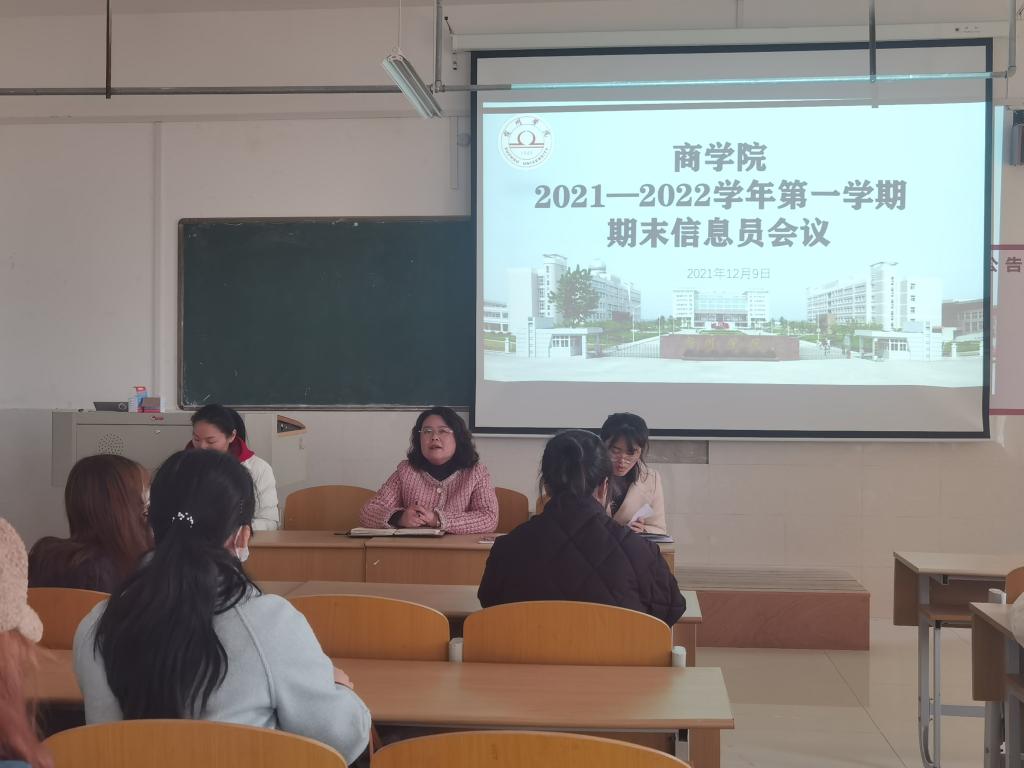 为进一步掌握教学管理动态,充分发挥学生参与教学管理的主体作用,确保教学质量监控和信息反馈,按照校、院相关文件精神及工作计划安排,商学院于12月9日中午在实训楼B306教室召开2021-2022学年第一学期期末教学信息员工作会议。会议由副院长宁青青主持,教学秘书王红艳、教务员杨宇晴及商学院全体教学信息员参加会议。