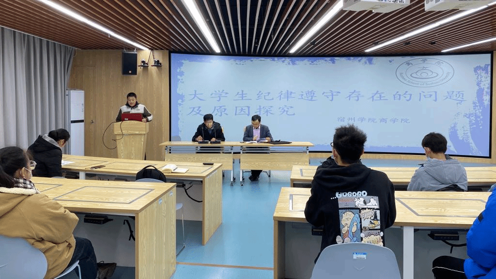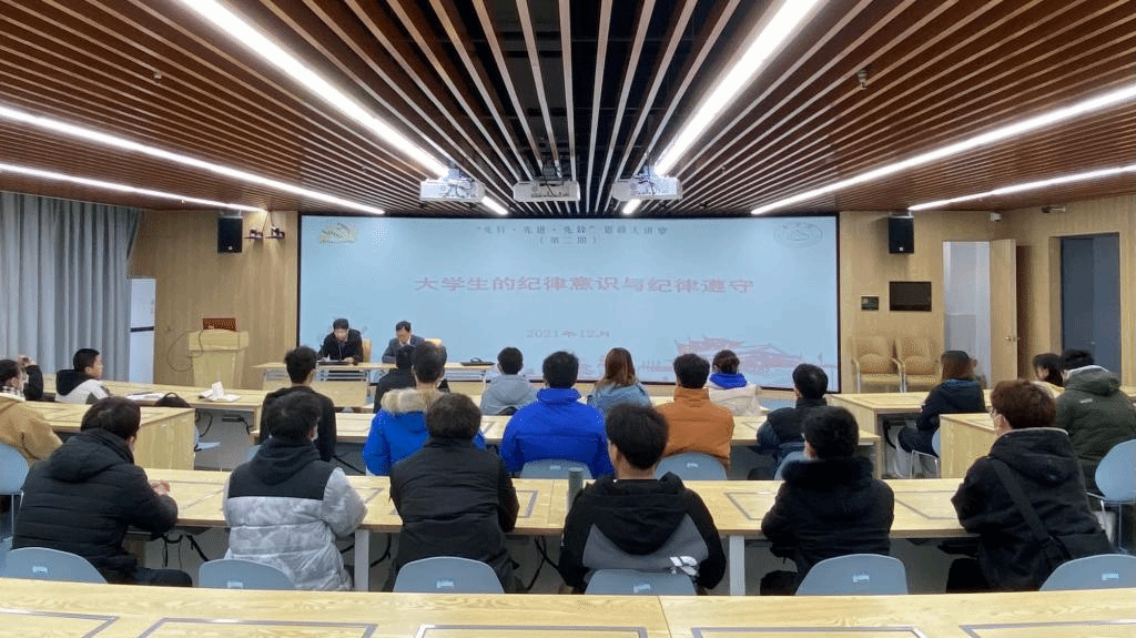 为进一步学习贯彻党的十九届六中全会精神,深化“三全育人”试点工作,加强学生的纪律建设,营造良好的学风考风氛围,12月24日,商学院在实训楼B215报告厅举办了第二期“先行·先进·先锋”大讲堂活动。活动主题为“大学生的纪律意识与纪律遵守”。学院党委书记肖良做开场讲话,辅导员王艳、孙茂顺做工作分享,组织员张锐锐、部分学生党员、学生干部和入党积极分子参加了本次活动。活动由组织员黄凯主持。
