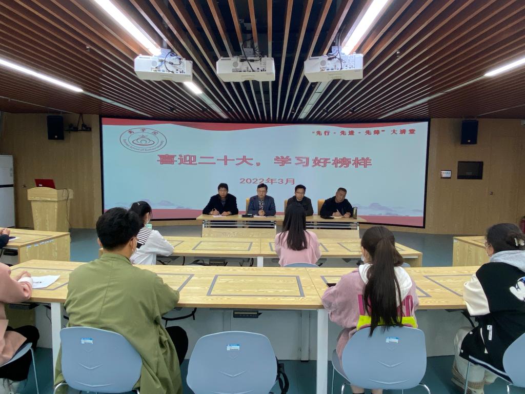 为进一步加强大学生思想政治教育,发挥先锋示范作用,营造良好学风,3月30日,商学院在实训楼B215报告厅以“喜迎二十大,学习好榜样”为主题举办第四期“先行·先进·先锋”大讲堂活动。院党委书记肖良做指导讲话,副院长(临时负责)刘红军、党委副书记周亚、组织员张锐锐、本批党员发展对象人选及部分班级干部共同参加了活动。活动由组织员黄凯主持。