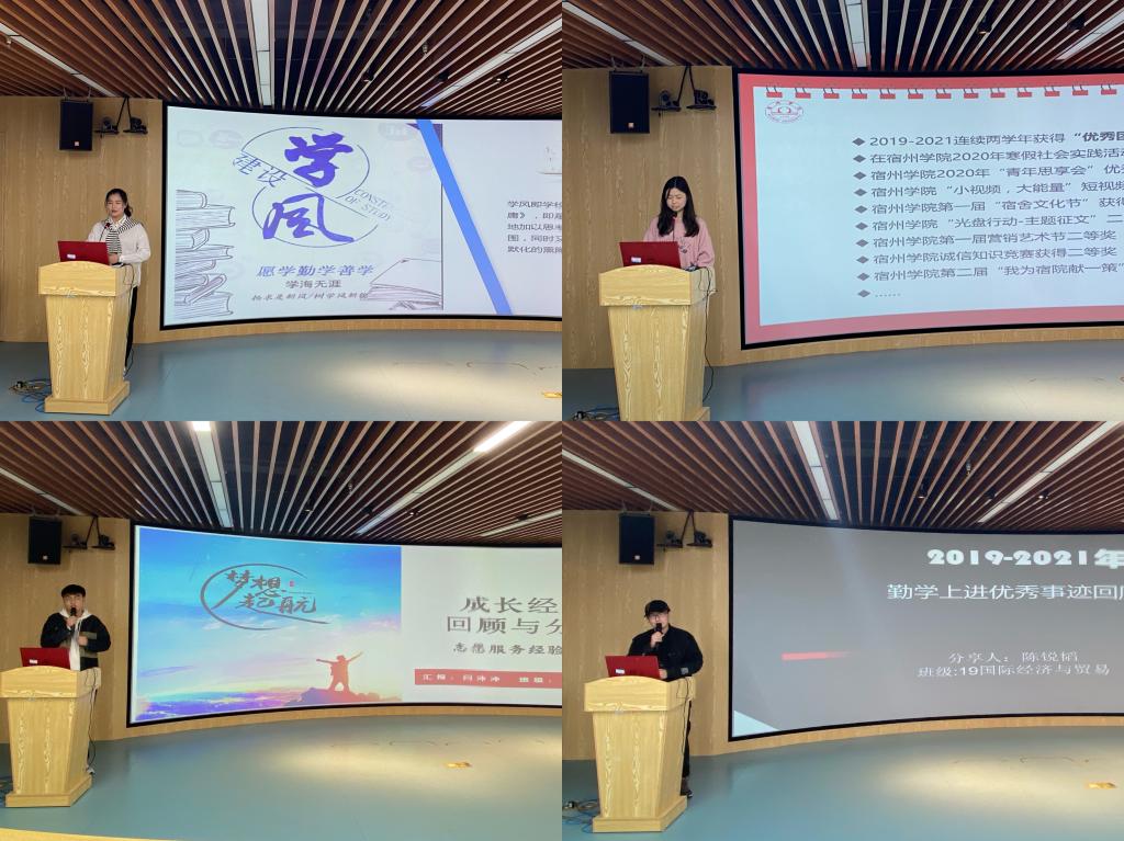 主题会上,来自2019级的会计1班王晓旭、会计2班张雅宁、电子商务班闫冲冲、国际贸易班陈锐韬等四位同学,分别从全面发展、卓越学习、志愿实践、科研探索等几个方面,通过现场讲述、PPT展示等形式,分享各自所取得的丰硕成绩和真情实感。