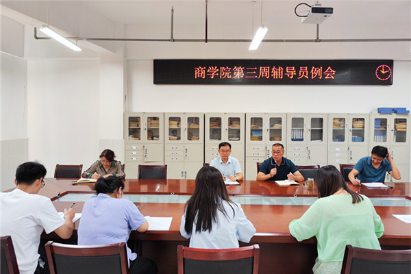 9月12日上午,商学院在实训楼B507会议室召开第三周辅导员工作例会。商学院党委书记肖良、副院长宁青青、组织员黄凯和全体辅导员(班主任)参加了会议,党委副书记周亚主持会议。