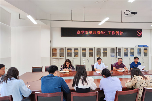 9月19日上午,商学院在实训楼B507会议室召开第四周学生工作例会。商学院党委书记肖良、副院长宁青青、组织员黄凯和全体辅导员(班主任)参加了会议,党委副书记周亚主持会议。