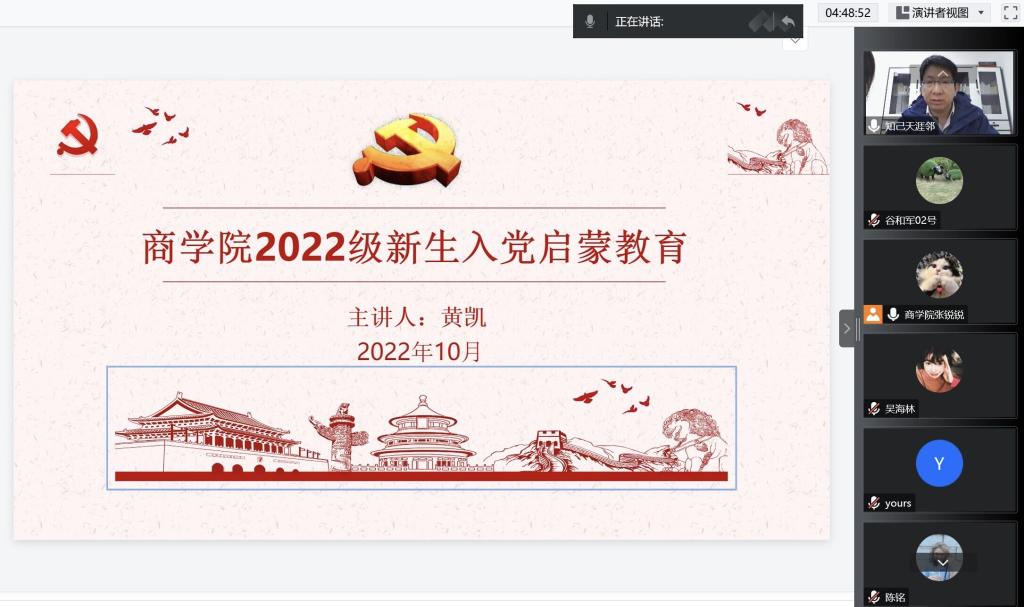 为提高新生的思想政治觉悟和政策理论水平,增进青年学生对党的了解,引导他们积极向党组织靠拢,10月12日下午,商学院举办了线上新生入党启蒙教育大会。