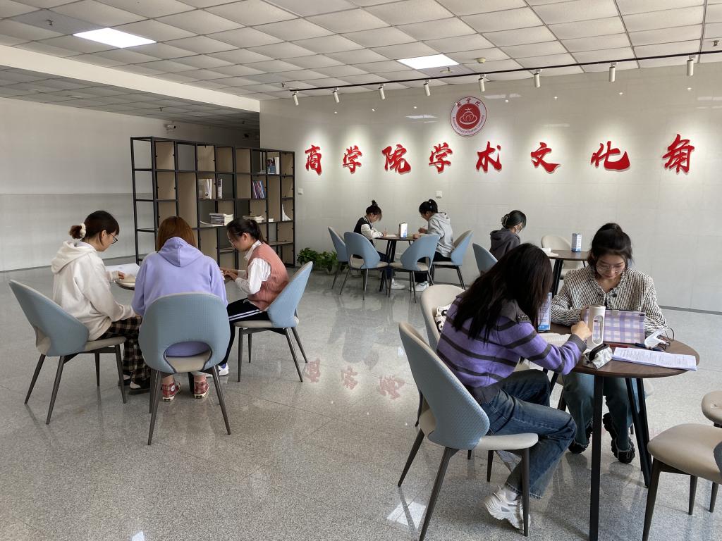 商学院坚持“小空间,大作为”建设理念,创设开放式学术文化角,订购专业书籍和学术期刊供学生阅读,帮助学生了解学术前沿、拓展学术视野、培育学术素养、提高科研能力,营造浓厚的学术氛围。结合“党建+人才培养双导师”工程,建立了若干个学习兴趣小组,经常在文化角开展学术交流,并邀请双导师或专业老师到场进行指导。让学生科研意识在文化角积极培育,让学术思想在文化角自由绽放,不断提高广大学生热爱科研的兴趣和培育理性思维的能力,是学院服务育人的重要内容。文化角结合大学生科研立项、大学生创新创业训练计划项目、学科技能竞赛等开展项目指导和赛前培训,提高了大学生各类项目的建设质量和申报层次,发挥了营造氛围、促进交流和整体提升的育人功能。