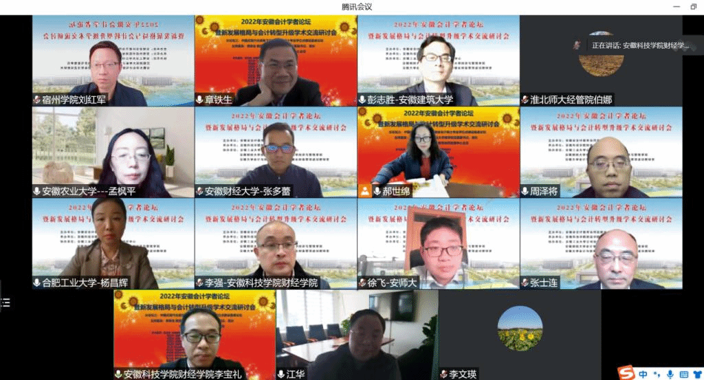 11月5日,由安徽省会计教育协同发展中心主办,安徽科技学院财经学院承办的2022年安徽会计学者论坛暨新发展格局与会计转型升级学术研讨会通过腾讯会议在线上成功举办。来自合肥工业大学、安徽大学、安徽工业大学、安徽财经大学等省内10余所高校的100余名学者齐聚云端,共议数智时代的会计研究热点问题和专业建设问题。我校商学院党委副书记、副院长(临时负责)刘红军教授,副院长(科研)周书灵教授、副院长(教学)宁青青教授应邀带队财务与会计教研室老师线上参加会议。