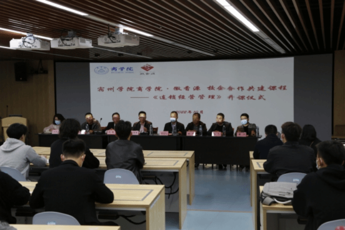 为深化创新创业教育教学改革,共同探索校企深度融合的教学改革新模式,进一步丰富“五育双创”大讲堂活动形式,2022年10月9日下午,商学院与徽香源校企合作共建课程开课仪式在实训楼B215教室举行。