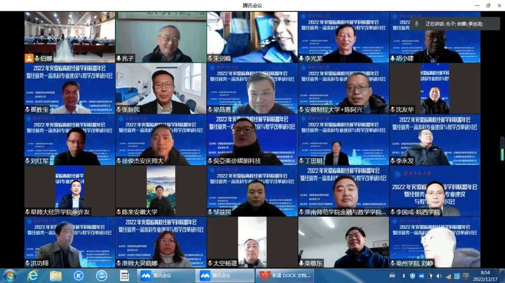 安徽省高校经管学科联盟2022年年会暨经管类一流本科专业建设与教学改革研讨会于2022年12月17日通过腾讯会议以线上线下结合的方式顺利举行。本次会议由淮北师范大学经济与管理学院承办,我校商学院党委副书记、副院长刘红军(临时负责)、副院长周书灵、副院长宁青青等商学院多名专业教师应邀参加会议。