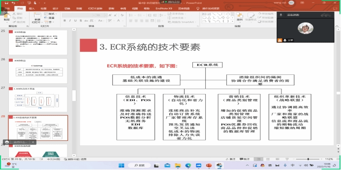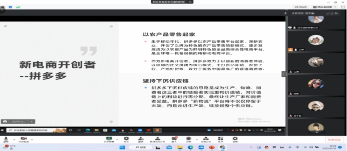 2022年11月14日,商学院市场营销教研室教师王翠结合省级课程思政示范课建设项目,面向2020级市场营销专业同学开展了《供应链管理》的课程思政公开课展示,商学院同行教师进行了线上观摩。