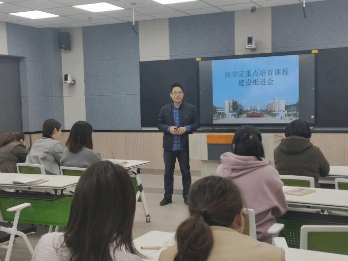 为进一步提升商学院课程建设质量,树立课程建设新理念,推进课程改革创新,提高教师教学能力,商学院于3月29日下午在实训楼B608录播室召开商学院重点培育课程建设推进会。会议由教学副院长宁青青主持,相关课程负责人及成员参加会议。