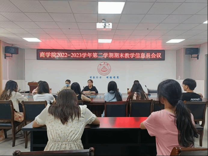 为充分发挥学生在教育教学活动中的主体作用,便于学院及时了解学生对教学和教学管理工作过程中的意见和建议,加强学生、教师、教学管理人员之间的联系和交流,按照校、院相关文件精神及工作计划安排,商学院于6月13日在实训楼B517会议室召开了2022-2023学年第二学期期末教学信息员会议。会议由教学副院长宁青青主持,教学督导徐旭、教学秘书王红艳、教务员贾晓霞及全体教学信息员参加了本次会议。