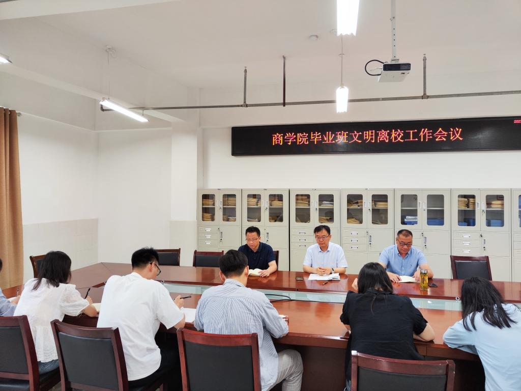 为扎实做好毕业生文明离校工作,确保毕业生离校前各项工作安全、文明、有序进行,6月19日上午,商学院2023届毕业生文明离校工作会议在实训楼B507会议室召开,商学院党委书记肖良,党委副书记、院长刘红军,全体毕业班辅导员参加了会议,会议由学院党委副书记周亚主持。