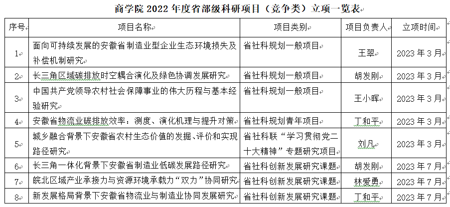 至此,安徽省2022年省级社科类研究课题立项工作全部结束,商学院取得8项省部级研究课题(竞争类)立项的优异成绩,其中安徽省哲学社会科学规划课题4项、安徽省社会科学创新发展研究课题“学习贯彻党的二十大精神”专项课题1项、安徽省社会科学创新发展攻关课题3项。科研项目立项取得重大突破,实现质与量的飞跃。